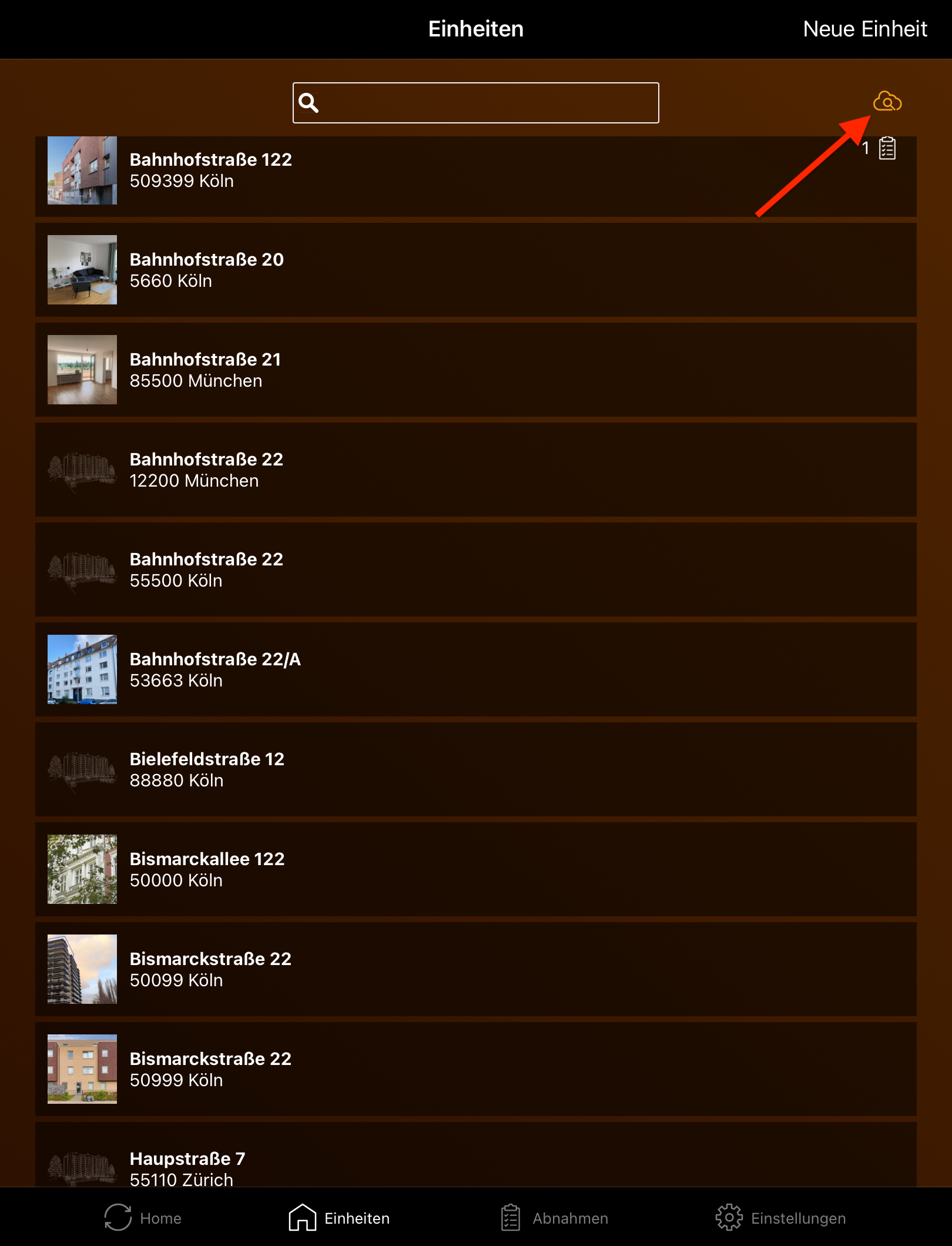 Keine Sorge, über das Cloud-Symbol oben rechts in Ihrer Einheitenliste können Sie eine Einheit aus der Cloud laden. Sie erhalten dann nicht nur die Einheit, sondern auch alle abgeschlossenen Abnahmen für diese Immobilie in Ihrer App.
