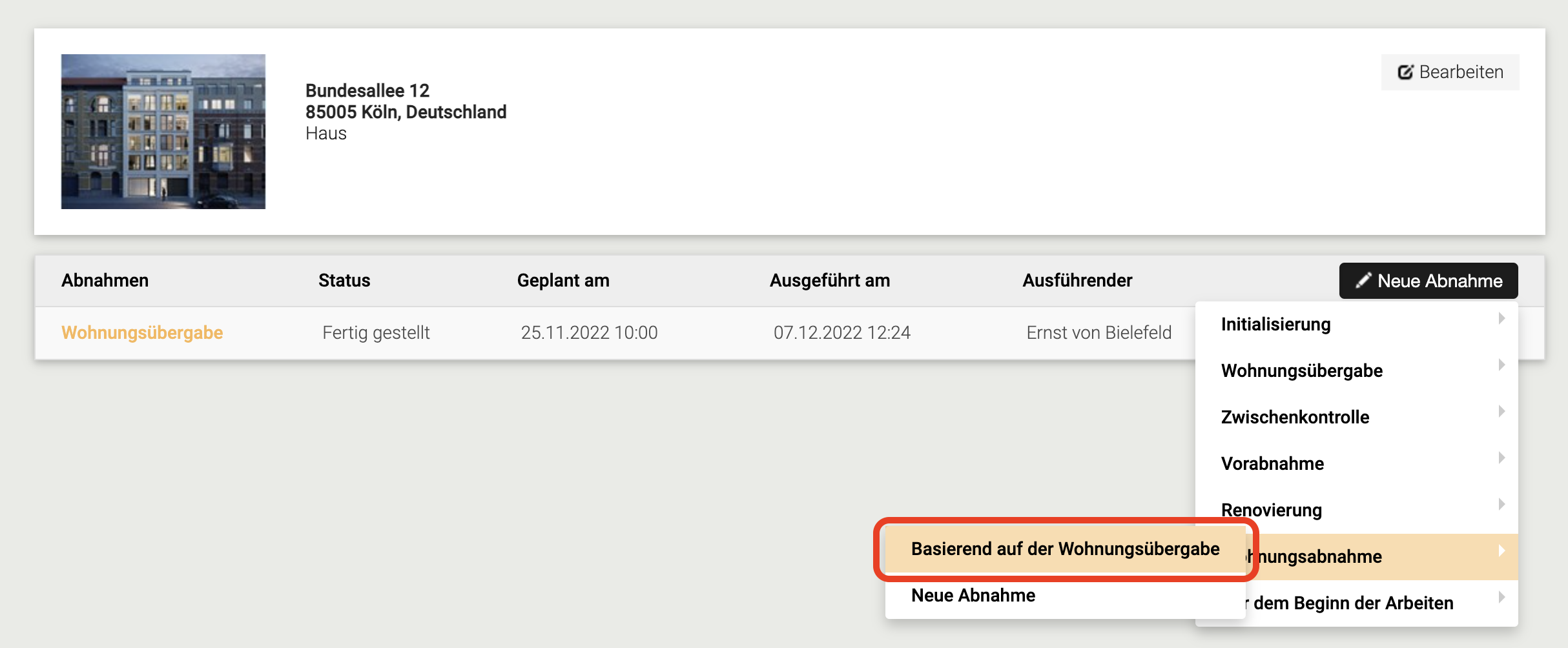 Das Prinzip funktioniert auch bei anderen Typen von Abnahmen. Sie können beispielsweise eine Zwischenkontrolle auf der Grundlage der Wohnungsübergabe, eine Wohungsabnahme auf der Grundlage einer Vorabnahme und sogar eine neue Wohnungsübergabe auf der Grundlage der vorherigen Wohnungsabnahme durchführen.