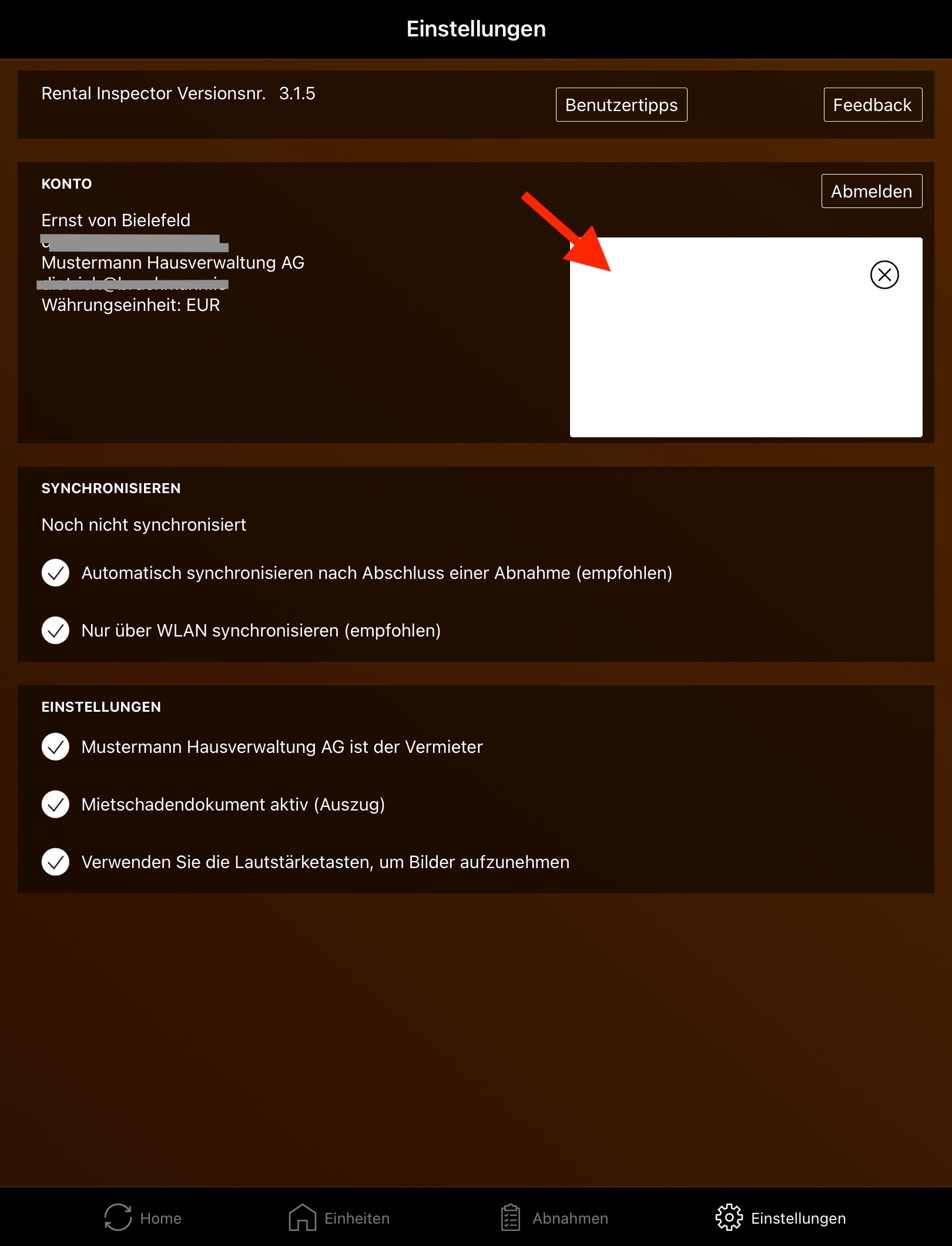In den Einstellungen der App können Sie Ihre Unterschrift speichern. Auf diese Weise werden alle Protokolle, die Sie erstellen, automatisch von Ihnen (als Ausführender der Abnahme) signiert.