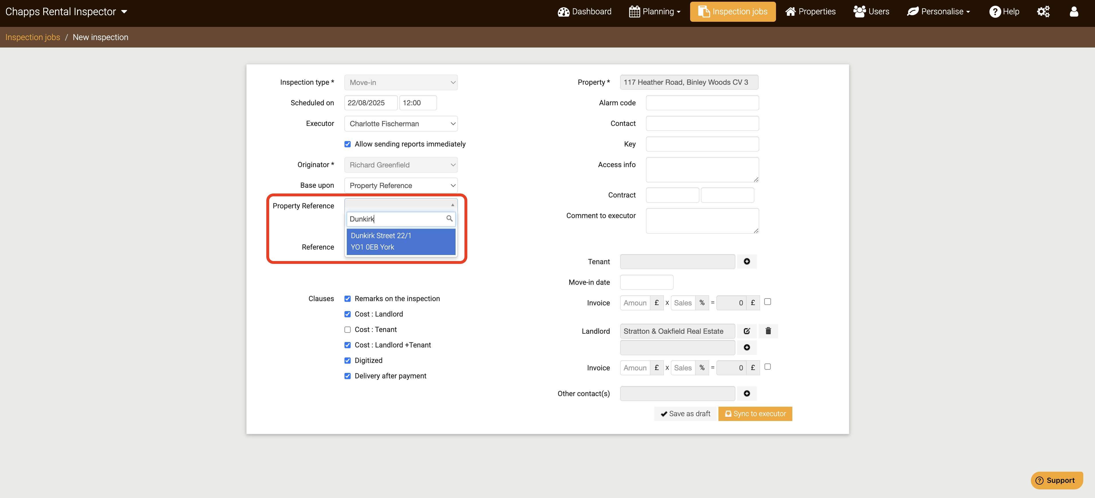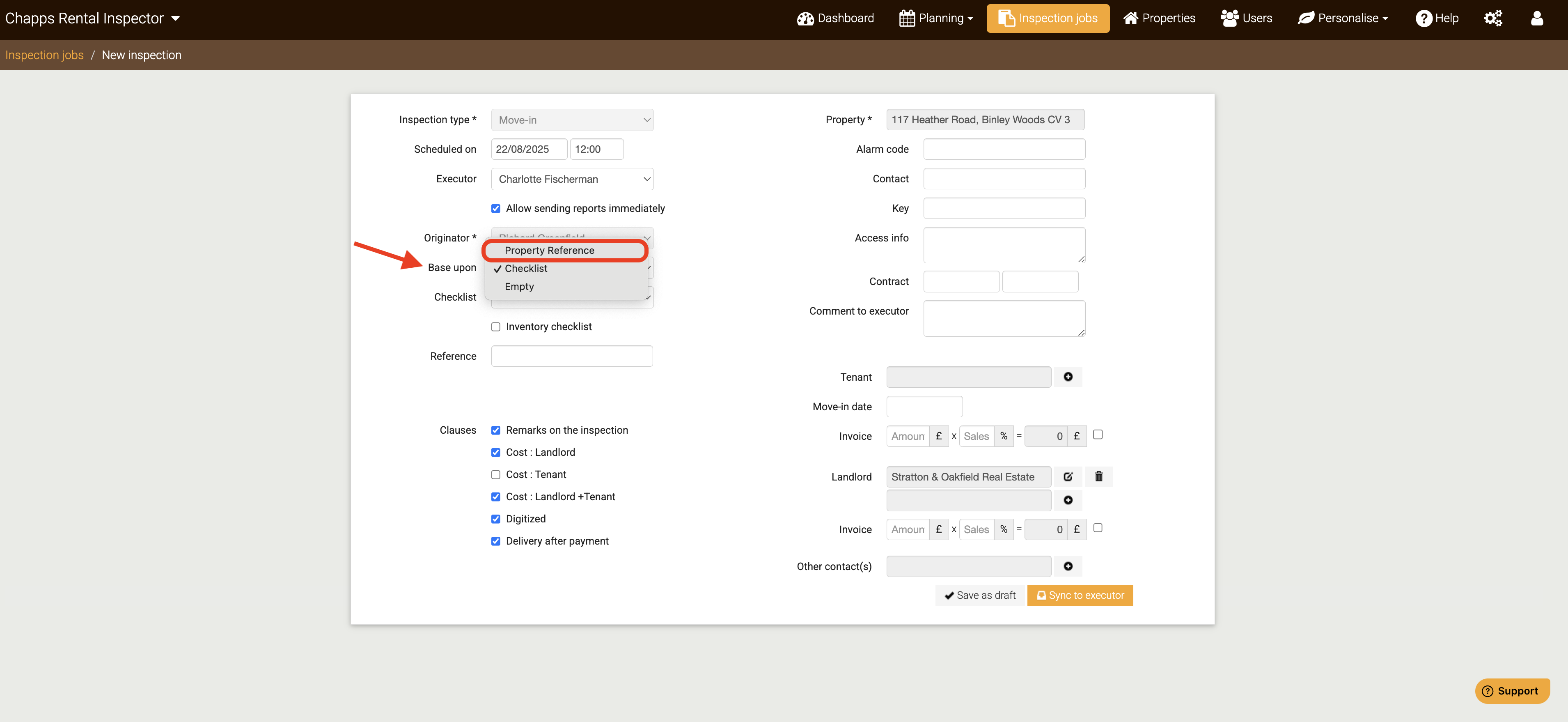 See below how you can base an initial rental inspection of a property in the Rental Manager on a previously completed rental inspection of another property, instead of a checklist, by choosing "Property Reference" on the Base upon dropdown: