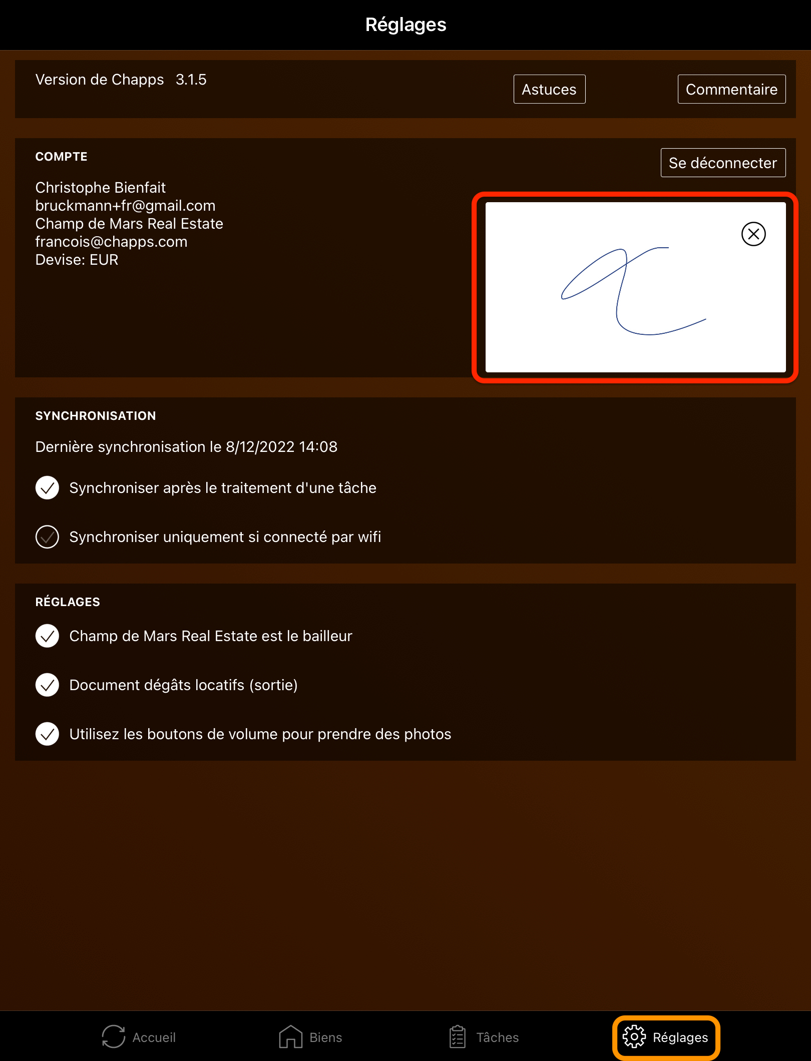Dans les paramètres de l'app, vous pouvez enregistrer votre signature. De cette façon, tous les rapports que vous créez sont automatiquement signés par vous (en tant qu'exécuteur de l'EDL).