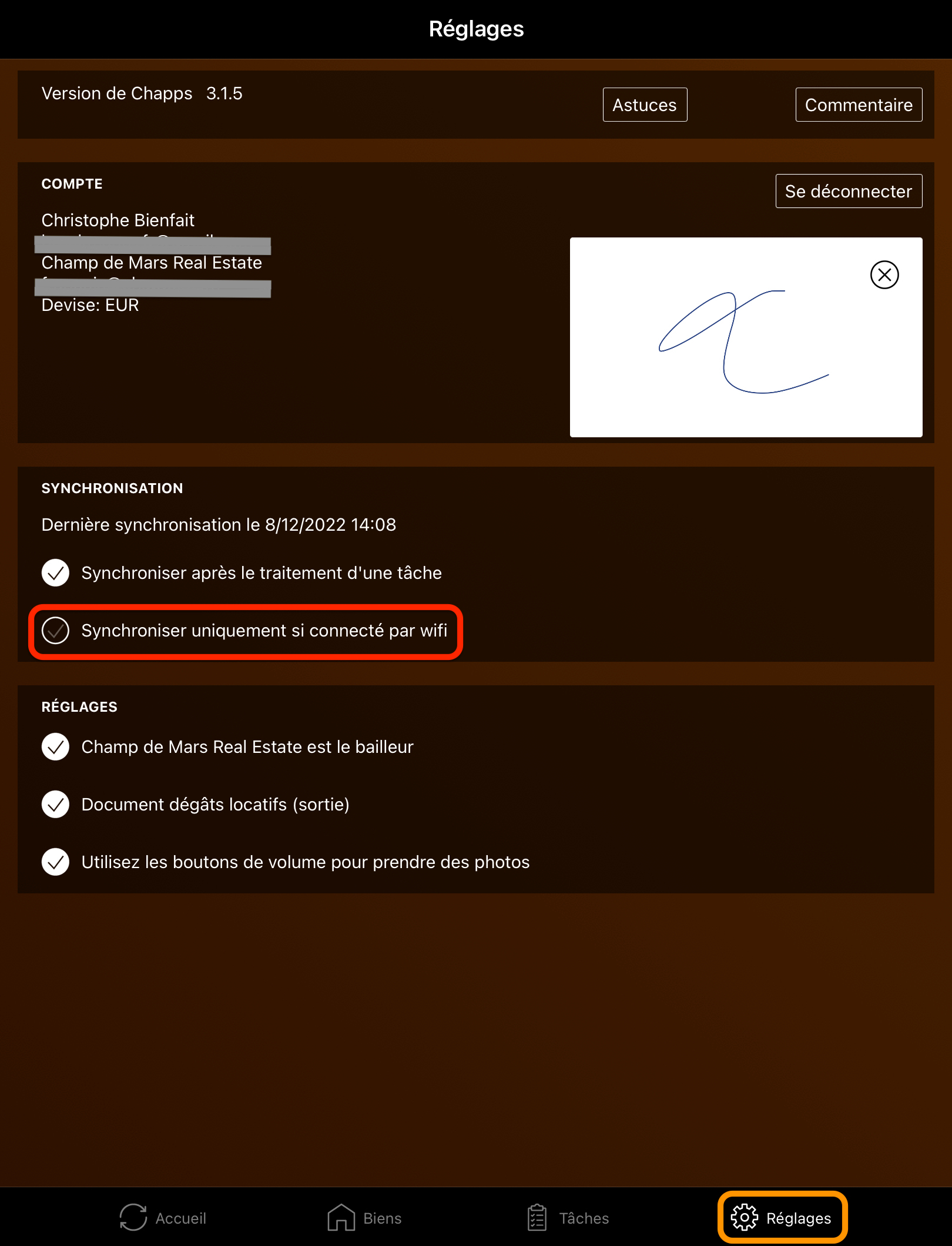 Par défaut, l'application Rental Inspector ne se synchronise que via le WiFi.