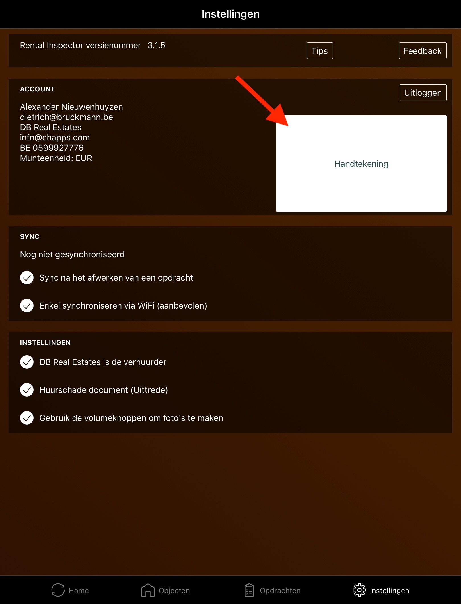Via de instellingen van de app kun je jouw handtekening bewaren. Op die manier worden alle rapporten die je maakt, automatisch ondertekend door jou (als de uitvoerder).