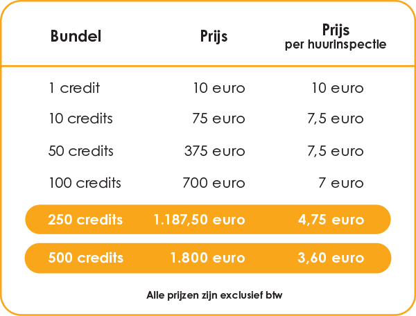 - Credits - die koop je individueel aan of in een voordelige bundel (aanbevolen). Je hebt 1 credit nodig voor elke huurinspectie/plaatsbeschrijving dat je afwerkt en synchroniseert.