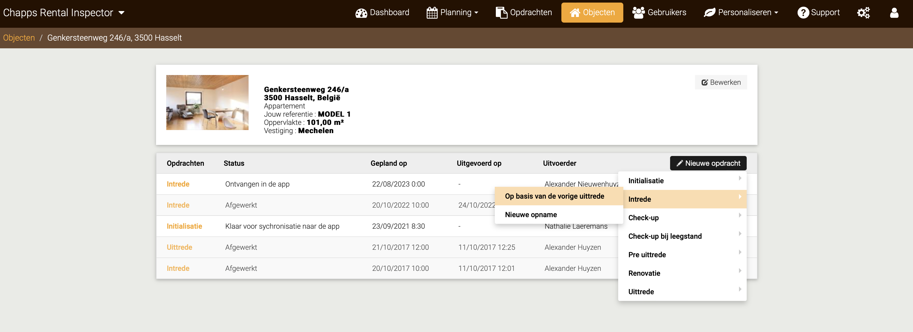 Ga naar het gewenste pand in de Rental Manager en klik daar op "Nieuwe opdracht". Wanneer er voor dit pand al een afgewerkte huurinspecties zijn, kun je kiezen om op basis van de vorige huurinspectie te werken. Is er geen vorige opname (bijvoorbeeld omdat het pand nieuw is in de Rental Inspector Pro), dan heb je alleen de keuze voor een nieuwe opname.