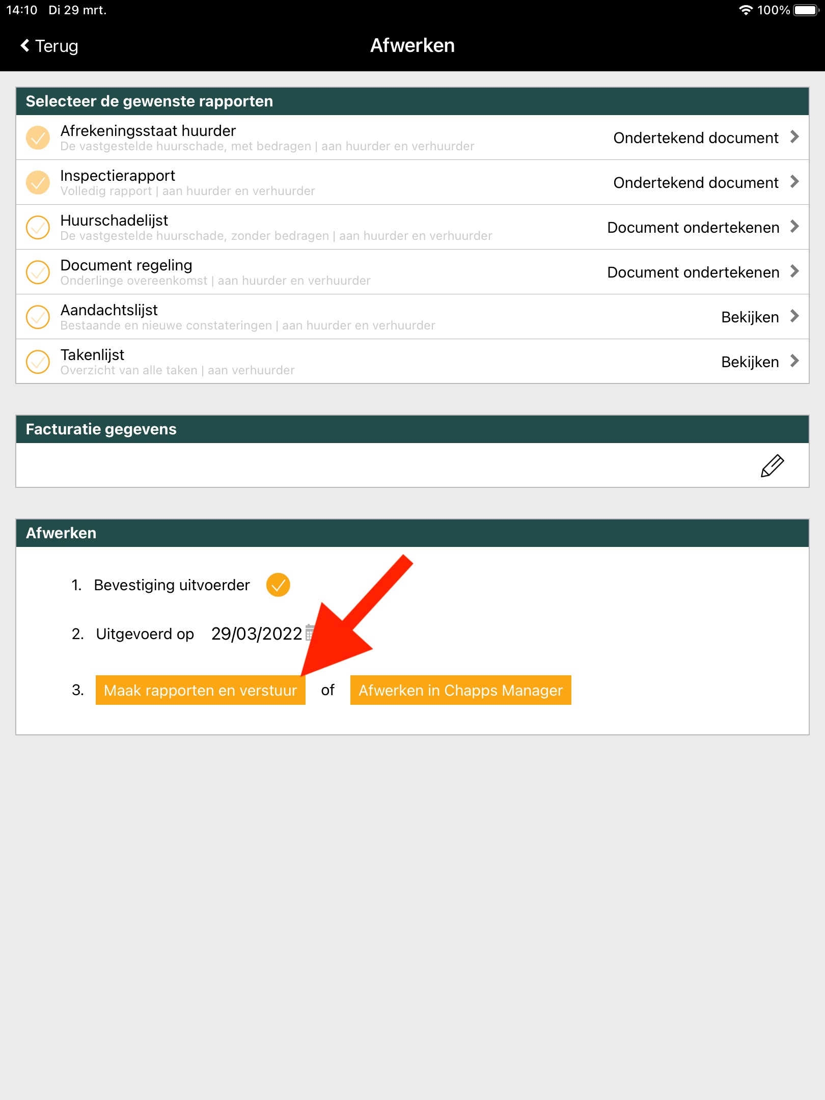 Kies je voor de andere optie (Afwerken in de Chapps Manager) dan worden er geen rapporten gemaakt noch verstuurd. Je dient dan de rapporten nog zelf aan te maken in de Rental Manager. Het rapport kun je daarna vanuit de Rental Manager naar de partijen sturen.